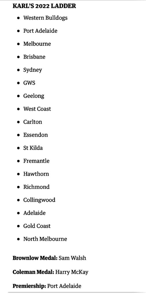 No way Sydney stay 5th with a tough draw. Geelong will slide finally. Absolutely aged list. Ofcourse he has WCE finishing 8th lol. They are on the slide but with 11 games at home will always have an advantage.