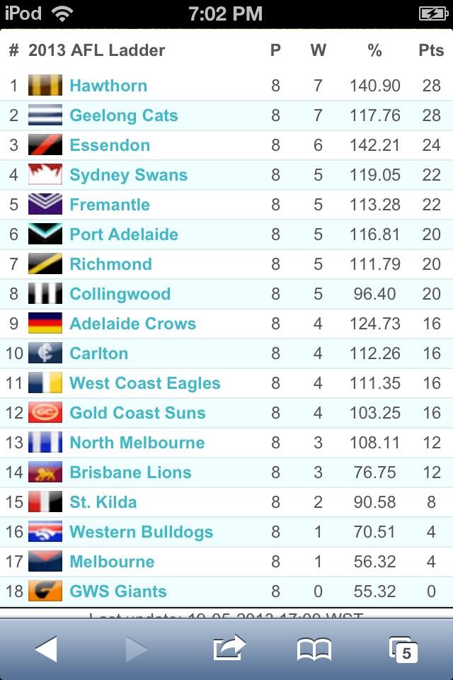 Quote from: one-eyed on May 11, 2013, 07:49:10 PMQuote from: Mrakov on May 11, 2013, 07:33:31 PMQuote from: one-eyed on May 11, 2013, 07:31:03 PMBack in the Eight http://www.afl.com.au/ladderPies win and Blues and we're ninth againWe'll only end up ninth if the Pies win narrowly (less than two goals). Freo is currently +56 (538/482) on aggregate compared to our +51 (700/649). It's only because they have played one less game and so have smaller for and against numbers that has then currenly 4% ahead.It's Richmond it'll happen lolImagine if it was Round 23 right now