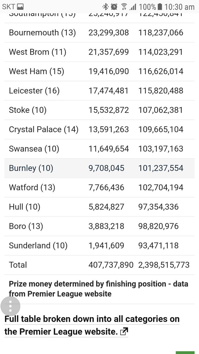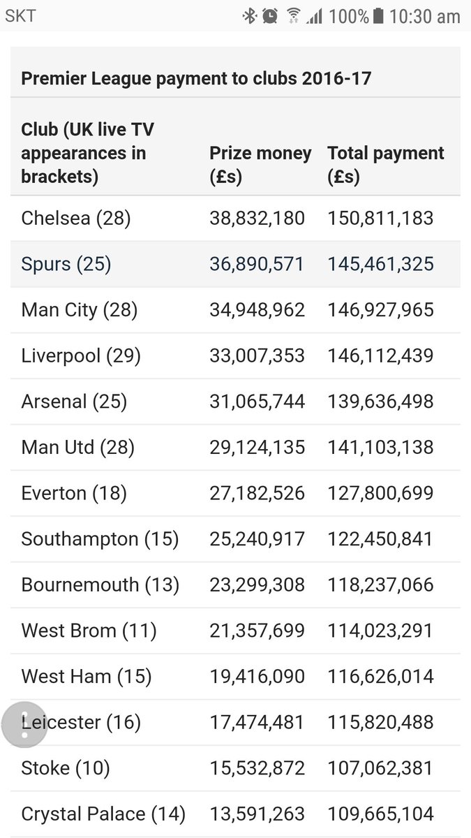"Money is the EPL is ridiculous. Bottom of the table Sunderland received over £93m for last season. World has gone mad."