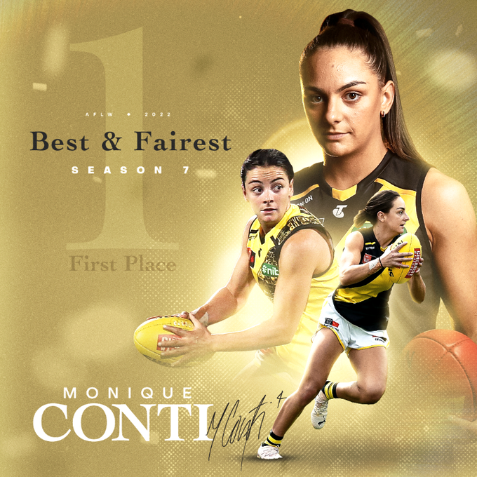 The award means Conti, 22, is now a five-time AFLW club best and fairest (four with Richmond, one Western Bulldogs), as well as a four-time All Australian, premiership player and best-on-ground in Grand Final winner.