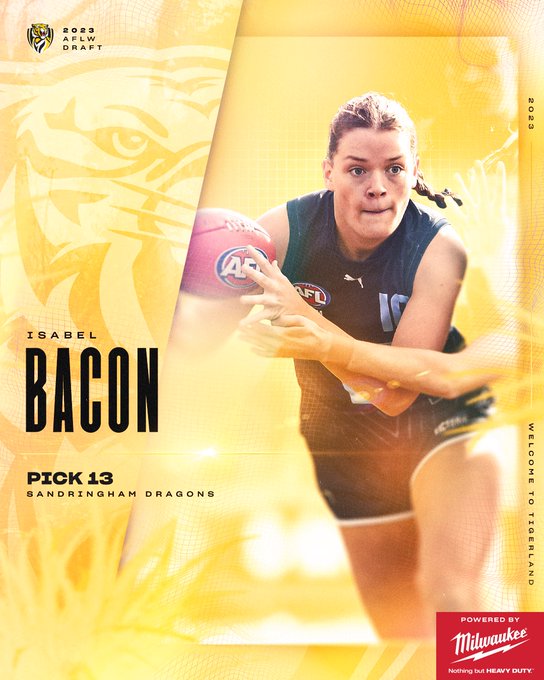 AFLW Tigers add BaconRichmond has selected pacy midfielder/defender Isabel Bacon with its first selection, No. 13 overall, at tonight’s AFLW Draft.