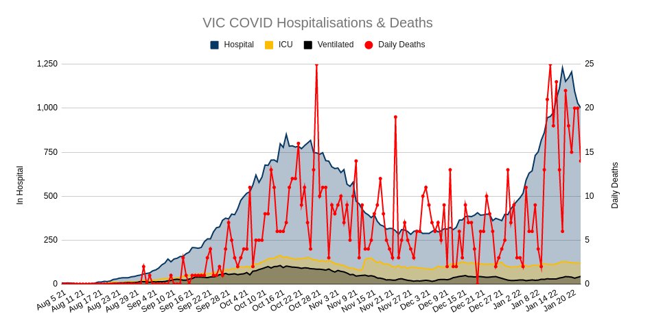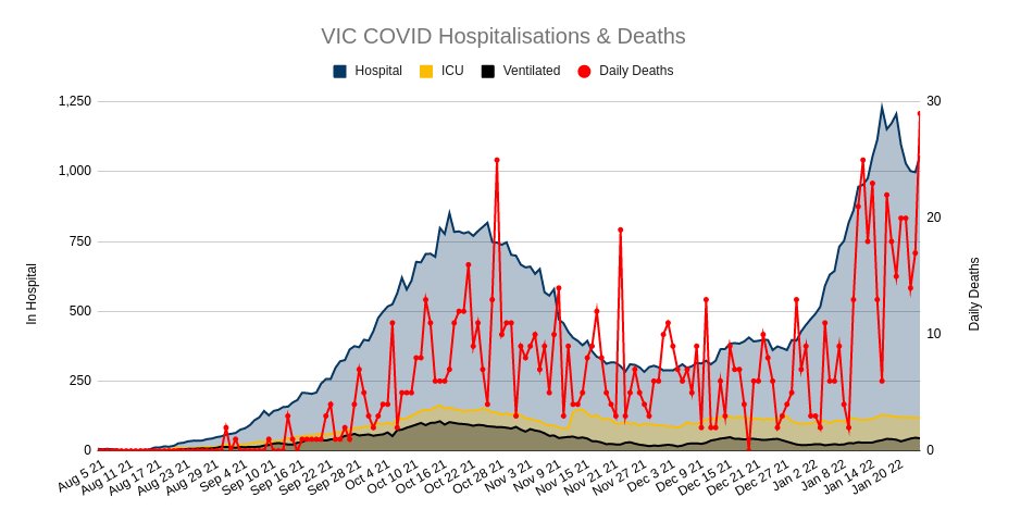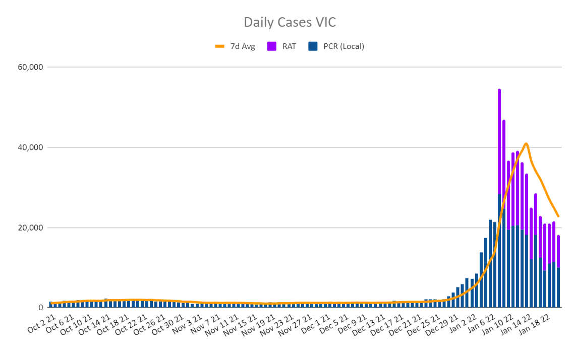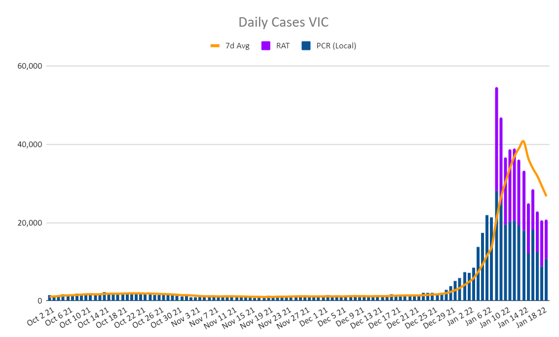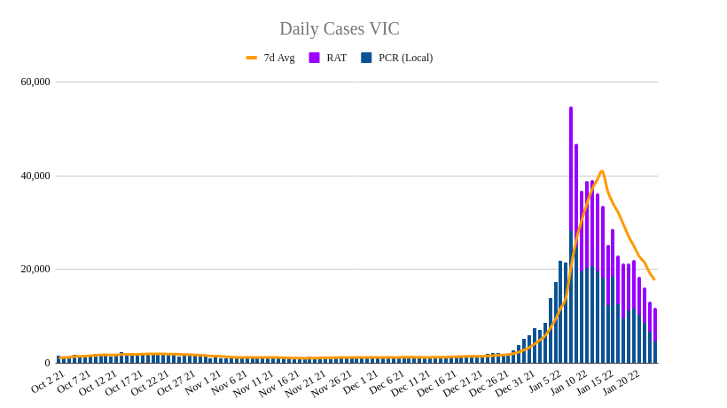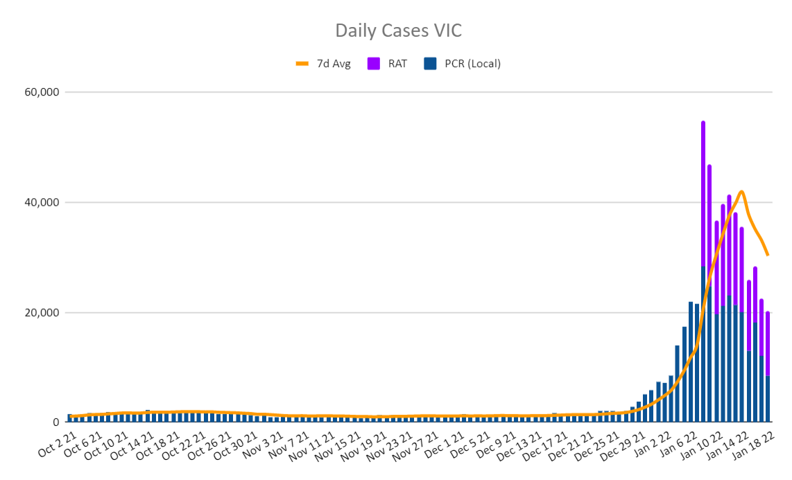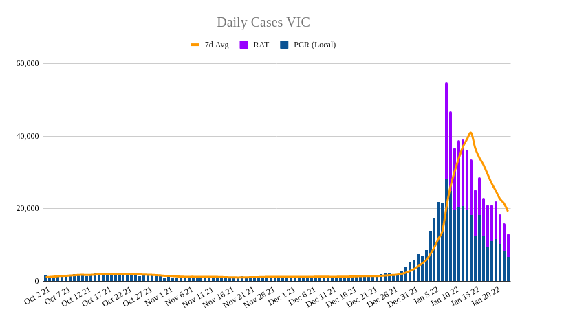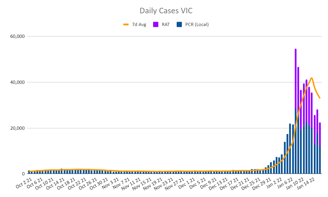 VIC - 20,180 new cases (PCR 8433; RAT 11,747). 1152 in hospital. 127 in ICU (43 on ventilators). 22 deaths.