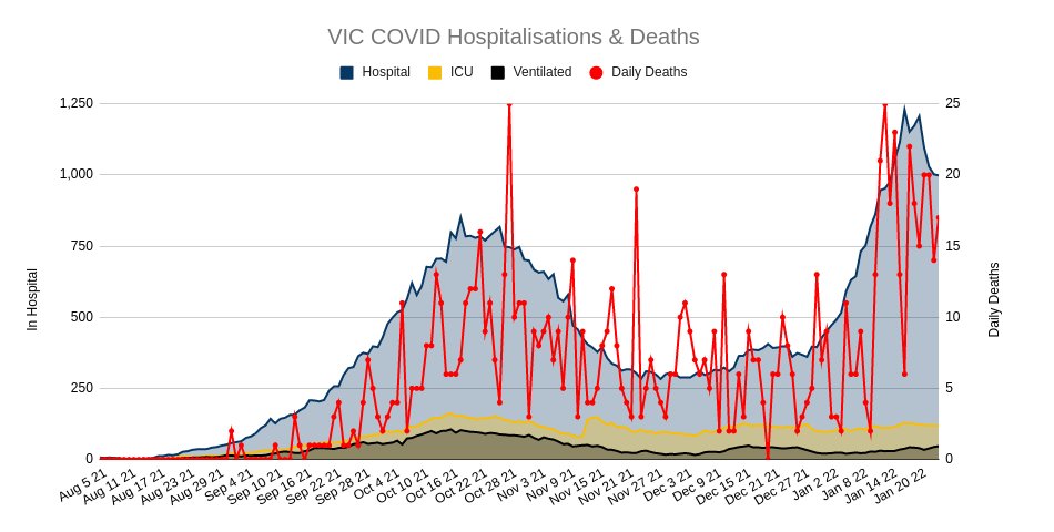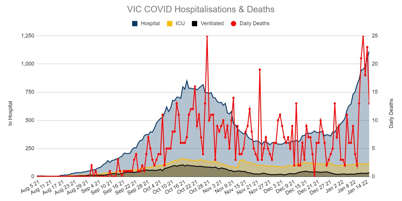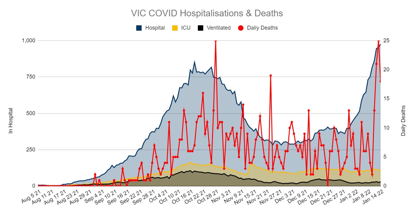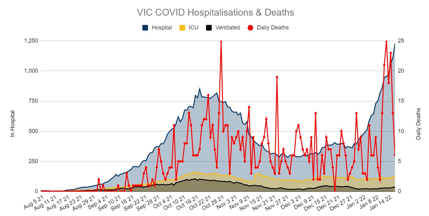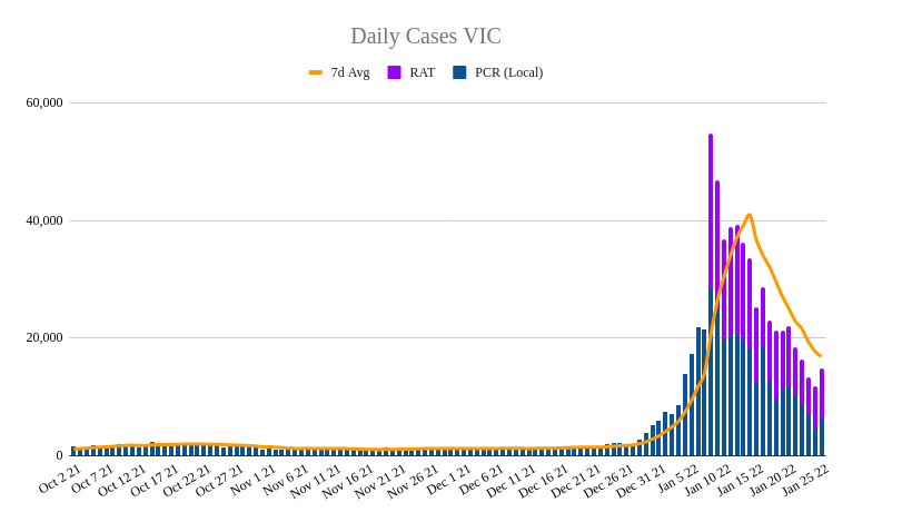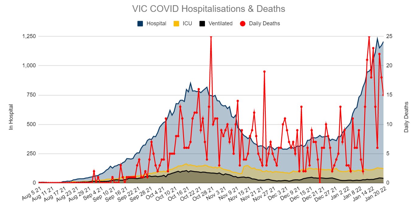 VIC - 20,180 new cases (PCR 8433; RAT 11,747). 1152 in hospital. 127 in ICU (43 on ventilators). 22 deaths.