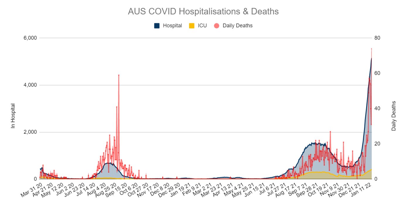 - They are hopeful Victoria has reached its peak in terms of cases (hard to tell with the voluntary RAT testing). However, there's a two week lag for hospitalisation and ICU admissions. So a code brown has been introduced across all Victorian hospitals for the next six weeks.