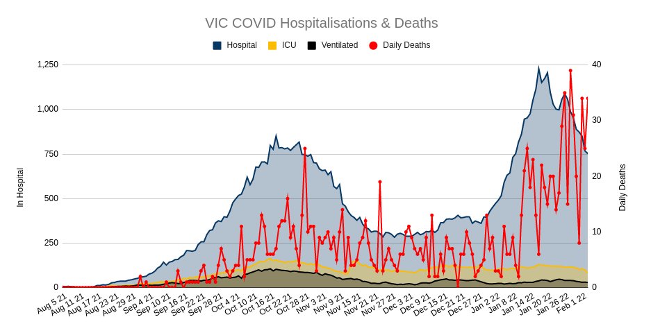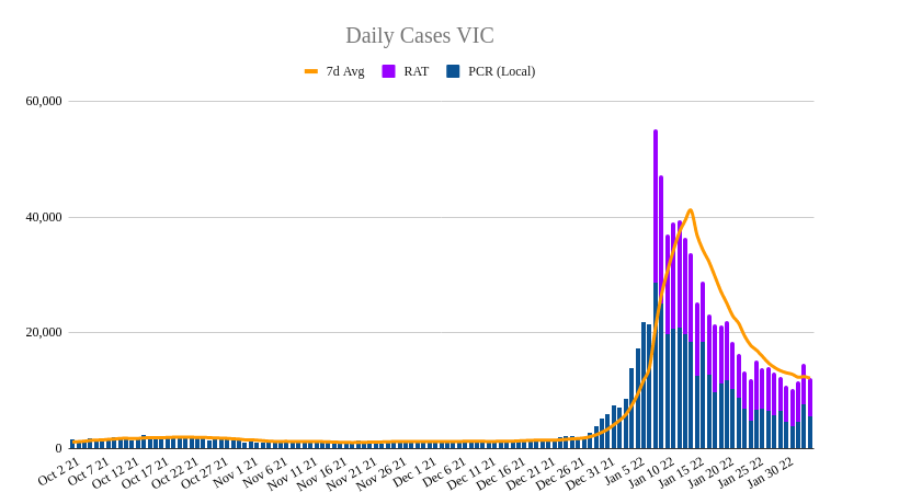VIC - 12,157 new cases (PCR 5588; RAT 6569). 752 in hospital. 82 in ICU (29 on ventilators). 34 deaths.