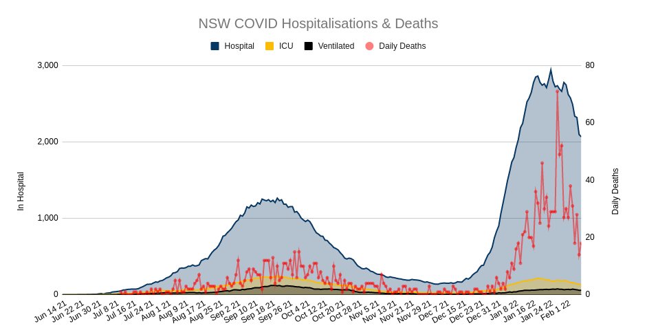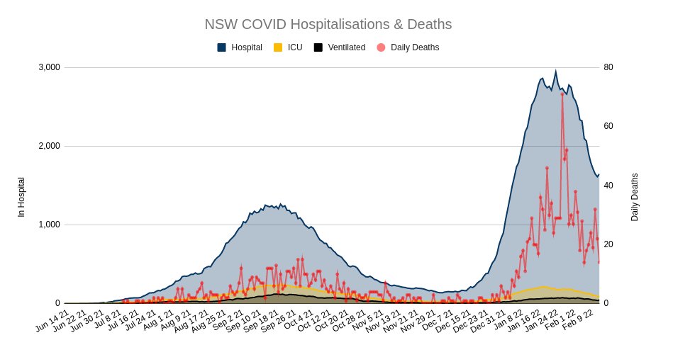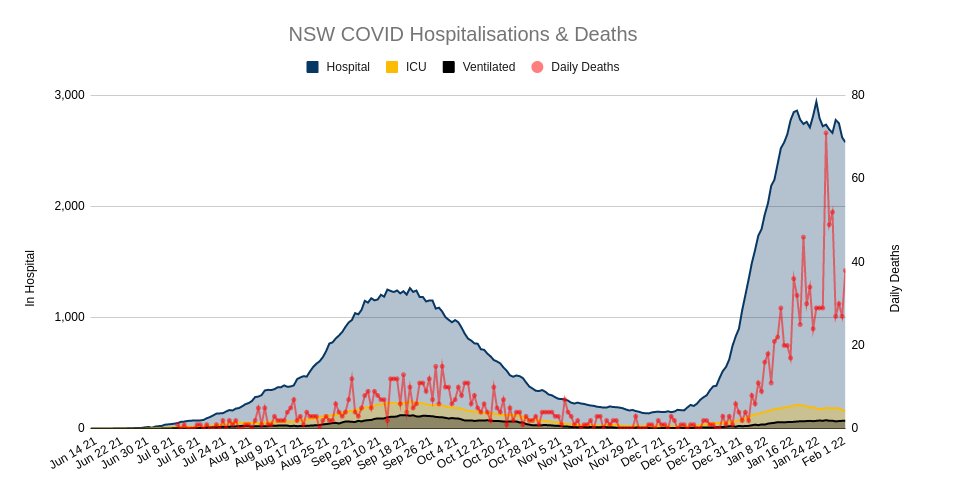 NSW - 12,632 new cases (PCR 5485; RAT 7147). 2578 in hospital. 160 in ICU (72 on ventilators). 38 deaths.