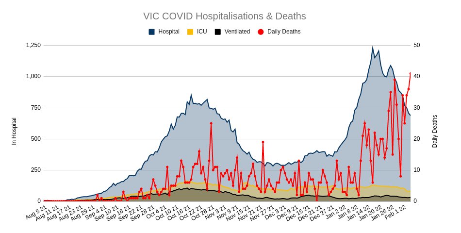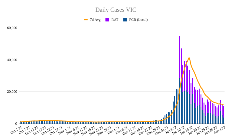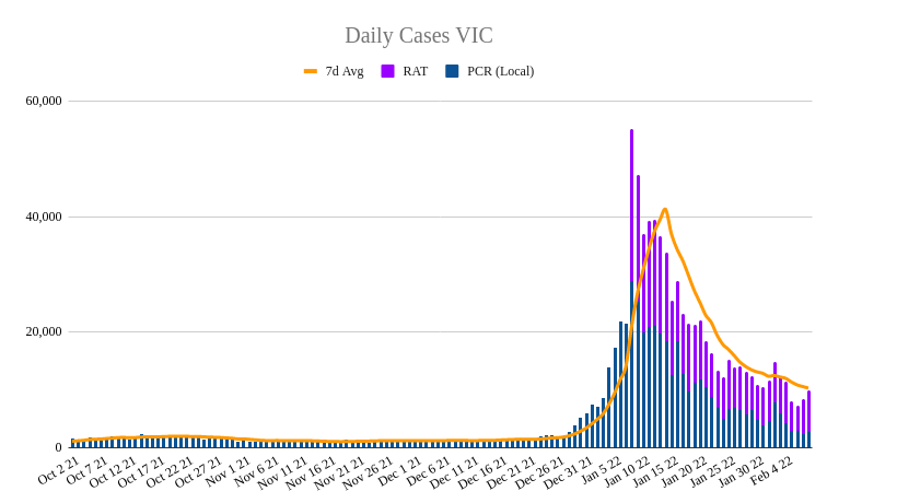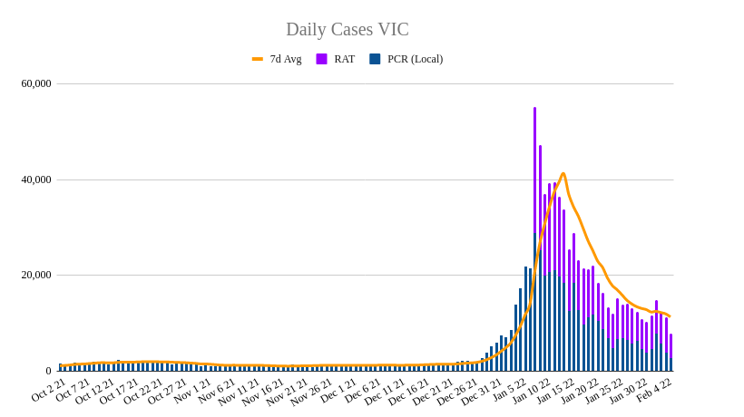 VIC - 7810 new cases (PCR 2711; RAT 5099). 687 in hospital. 80 in ICU (31 on ventilators). 41 deaths.