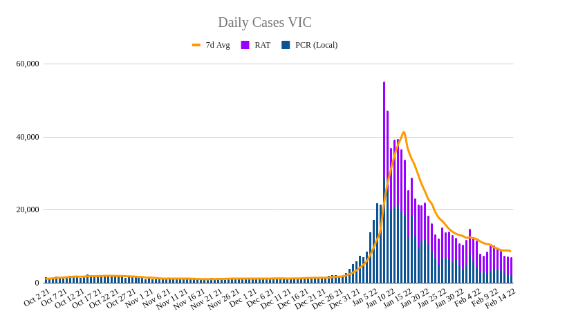 VIC - 6935 new cases (PCR 2606; RAT 4329). 451 in hospital. 64 in ICU (16 on ventilators). 14 deaths.