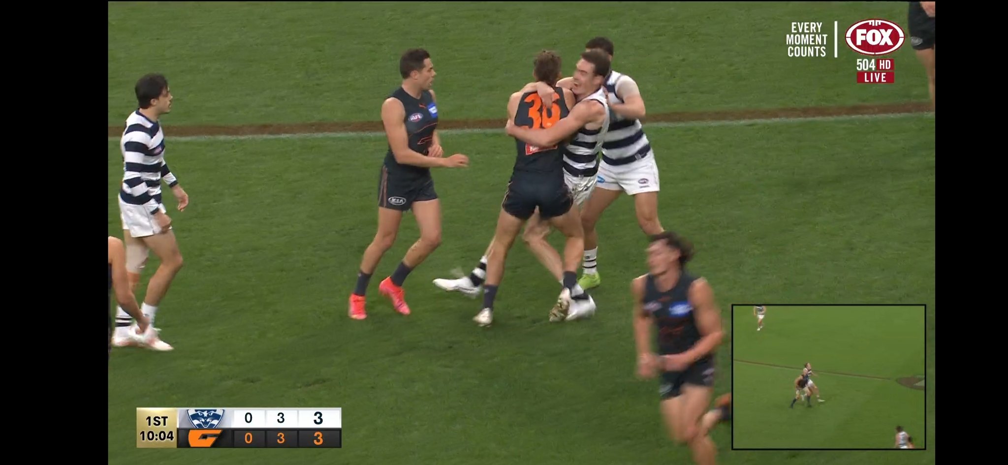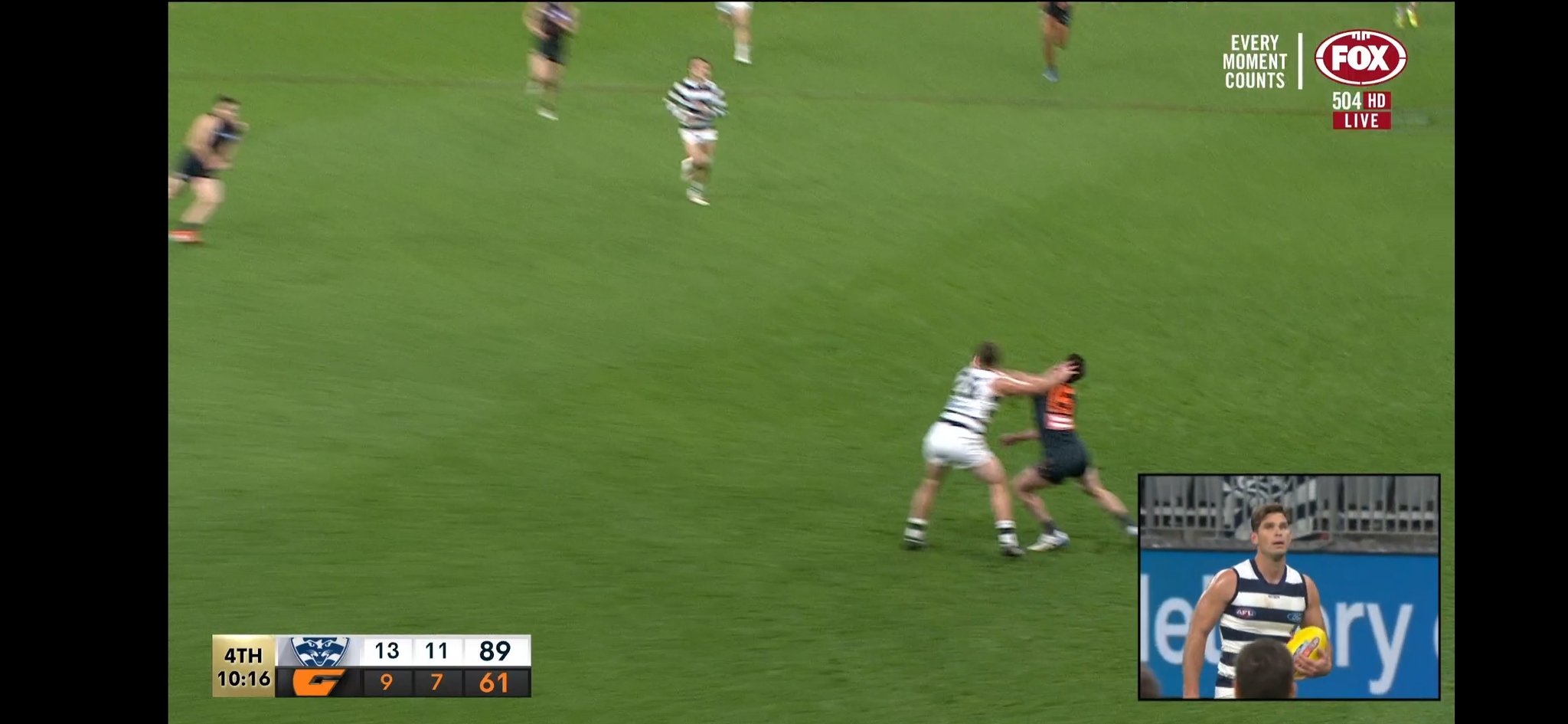 and this isn't a free kick because you apparently can put your opponent in a headlock if you're a Geelong player.