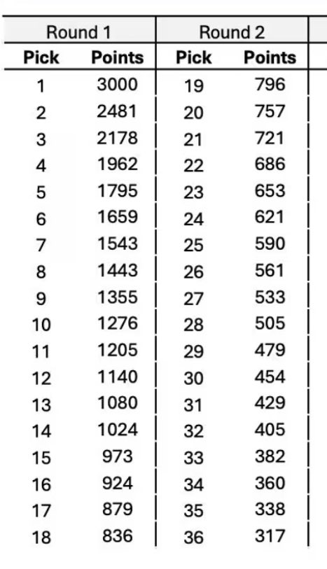 This is the new DVI which could be tweaked again. So if clubs are only allowed two picks to match a bid and they strip the current 10 per cent discount Blues would get exactly 3000 points (equal to pick 1) with picks 5 and 11. So challenging but not impossible to get Cody Walker