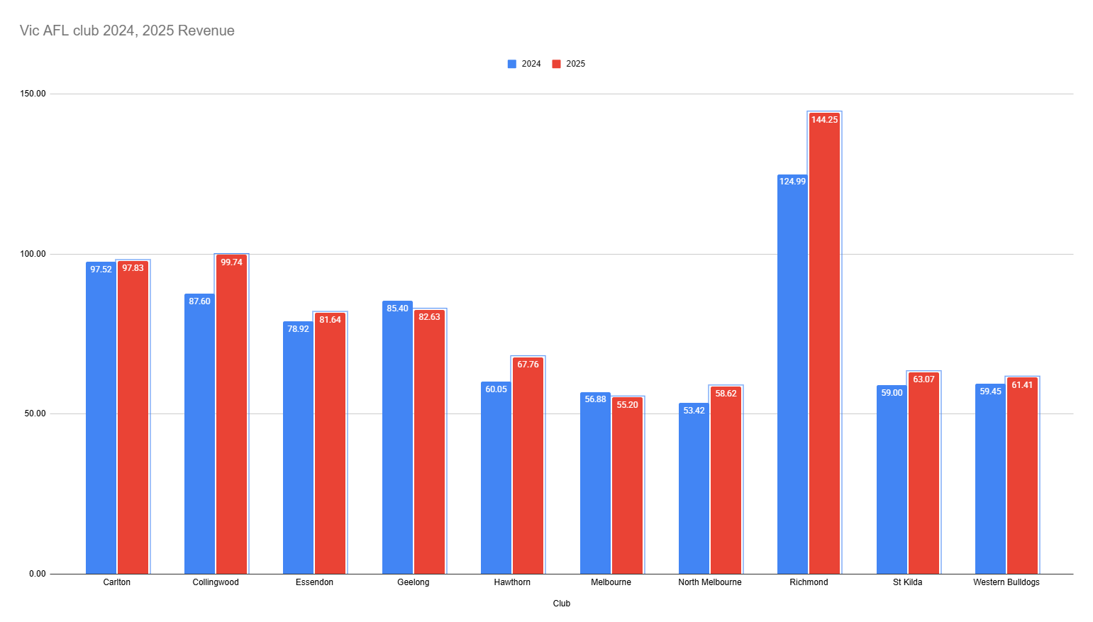 Victorian AFL clubs generated 812m in revenue for 2025. This is up 6.4% on 2024, up 47% over the last 5 years and up 32% since 2018.