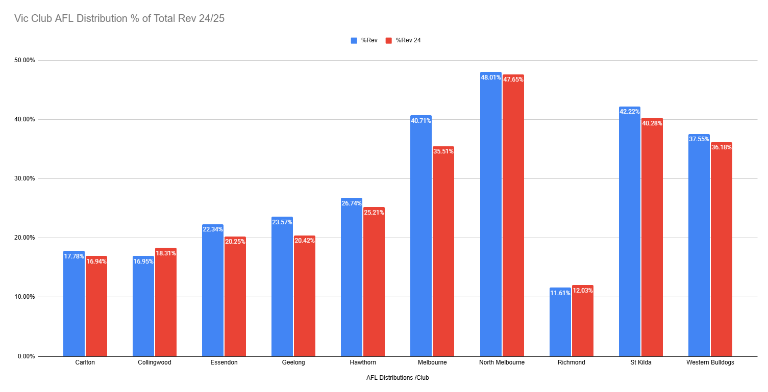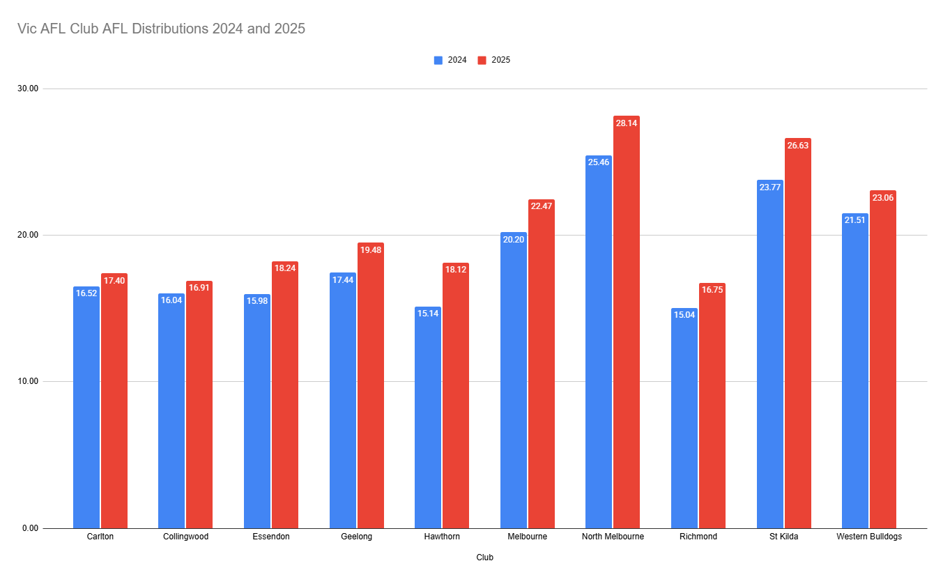 Victorian AFL Clubs received 207.19m in distributions from the AFL in 2025, up 10.75% on 2024, up 51% over 5 years and up 44% since 2018.