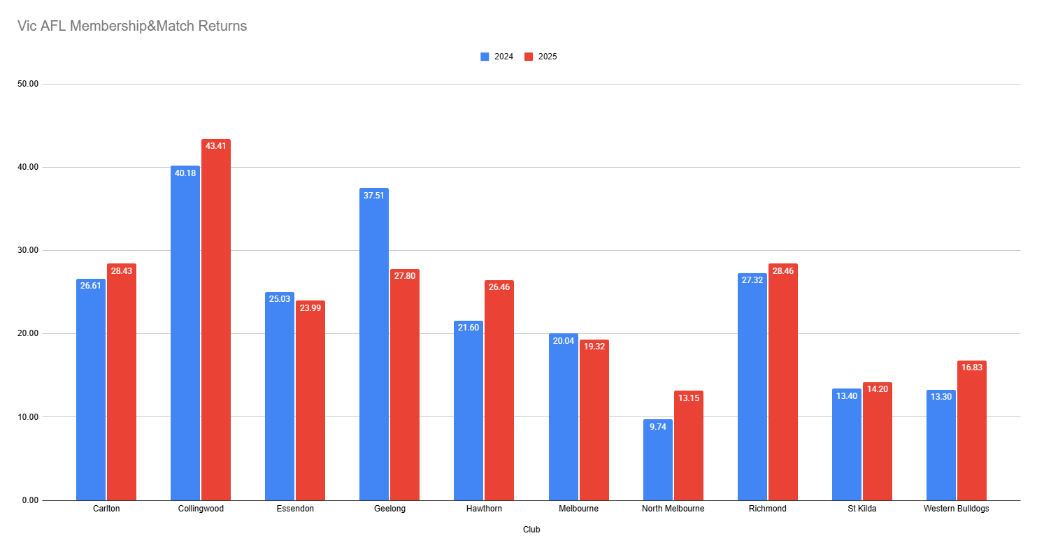 Victorian AFL Clubs took 242m in Membership and Matchday in 2025 - amounting to 30% of revenue taken ovall and up 3%  on 2024, +60% over 5 years and +52% since 2018.