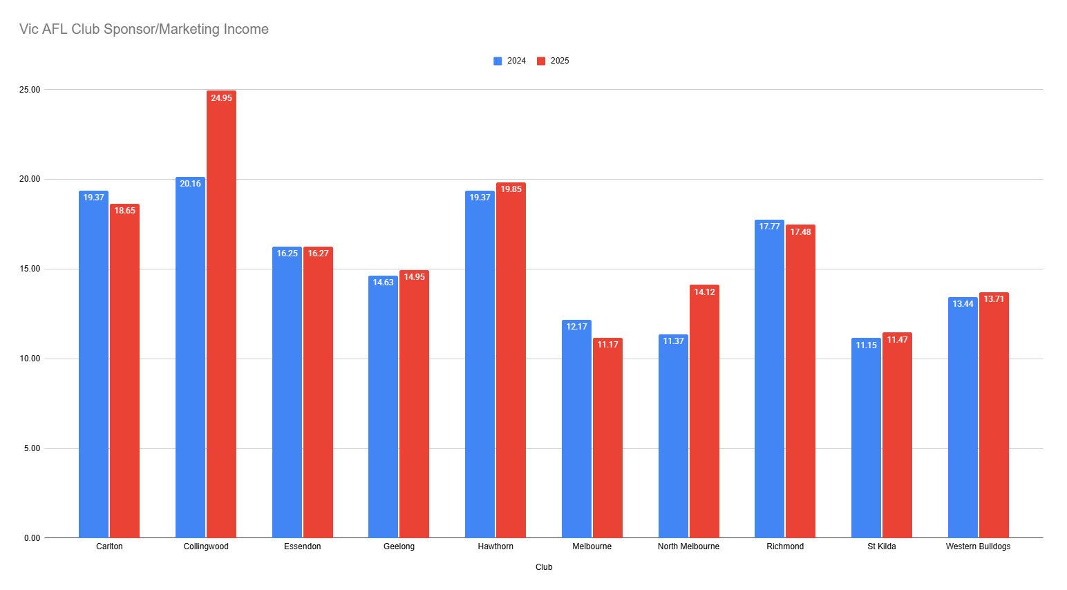 Victorian AFL CLubs turned over 162m in Sponsorship & Marketing funds for 2025, up 4% YoY (+49% over 5 years, and 19% since 2018)