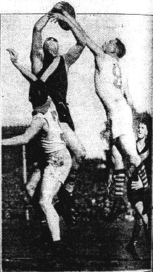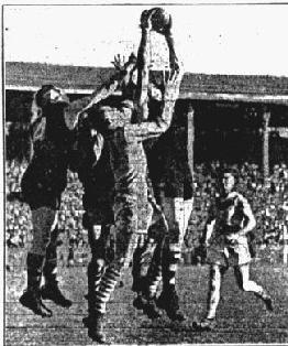 It was transparently clear from the opening minutes of the encounter that the wily, high-marking Titus, Richmond's experienced forward, would outmark, outwit and out-manoeuvre Austin, South's diminutive goalkeeper, and that the absense of Hillis, the Southerners' regular goal custodian, would be a serious blowto Southern prospects. It was also apparent that Sheahan, Richmond's vigorous goalkeeper, would outmatch Pratt, South's mercurial forward. South's tragic breakdown at both ends of the ground was the feature of the contest, but the obvious moves in position were never made. Sheahan, O'Neill, McCormack, Bolger, Baggott and G. Strang had command from the outset, and the Richmond forwards, moving briskly and working cleverly, soon had the Southern defenders off their normal balance.