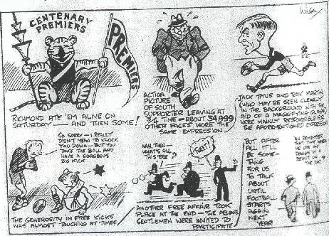 To say that Southern supporters were dumbfounded is stating the fact lightly. The Southern captain seemed equally bewildered, and failed to adopt drastic measures to meet the desparate situation. Wholesale place changes were justified but there were no moves. The Southerners certainly got into their stride in the last term when they kicked as many goals as in the first three quarters, but the fighting effort was staged an hour too late. Towards the end ultra-vigorous work led to loss of temper, and vicious blows were swung during two hectic fisticuff battles, but the umpires separated the over-heated combatants and play proceeded. Thousands of bitterly disappointed Southern supporters left the ground long before the game ended, and Richmond, to the delight of their huge following, raced on to secure the coveted Centenary premiership pennant, the final bell finding Richmond well ahead by 128 points to 89. The Richmond men thoroughly deserved the premiership, and are to be congratulated on their magnificent effort.