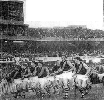 Suspended Richmond follower Neville Crowe rushed on to the field to hug and congratulate his team after their premiership win. One of the first players Crowe embraced was John Ronaldson, the ruckman who got his Grand Final chance because of Crowe's suspension. Ronaldson got only six kicks for the match, not nearly as many as the Tigers' best players like Barrot, Brown and Bartlett. But how he made four of those kicks count. His one kick in the first quarter - it was a miskick - went to Royce Hart who goaled ... his single kick in the second quarter was a goal ... and his two kicks in the last quarter went through for goals. The out-stretched fingertip mark by Ronaldson on the run near the boundary line in front of the MCC members' stand in the last quarter was a great feat alone, but the long drop kick goal which followed really brought the house down. "I didn't mean to kick a goal. It was not a delibrate shot. It just kept going." Ronaldson said.