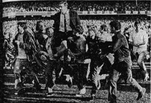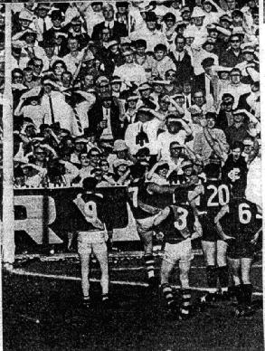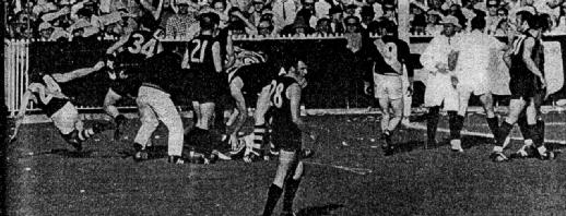 Right: At one stage all the umpires and some trainers were trying to soothe ruffled tempers. With Moore fully recovered and prepared to take his kick, Umpire Crouch gave him a 15 yd. penalty which put the mark right on the goal line. Moore had no difficulty in kicking his second goal and putting the Tigers only four points behind.