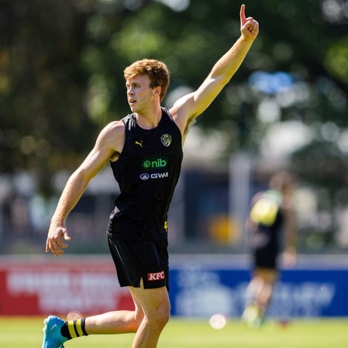 Harry Armstrong is looking primed for a big 2026 season as he impressed in a full oval scrimmage drill, where he took a big leaping mark about 45 meters out and proceeded to go back and slot the goal cleanly. His strong hands and attack on the footy are what made him a real threat in the forward line during his first year at the Swinburne Centre, a skill that has only gone from strength to strength this off-season.
