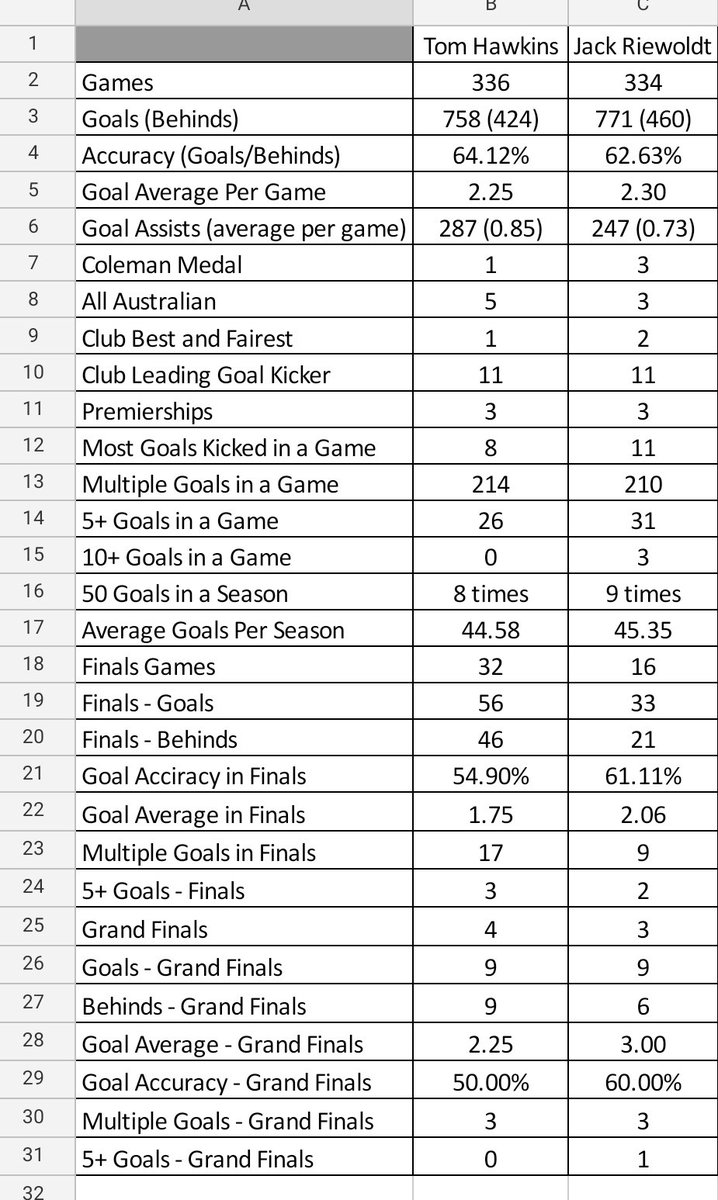 Hawkins and Riewoldt between them have claimed six premierships, eight All-Australians, four Coleman Medals and three best and fairests between them. They’ve kicked a combined 1529 goals from 670 games.